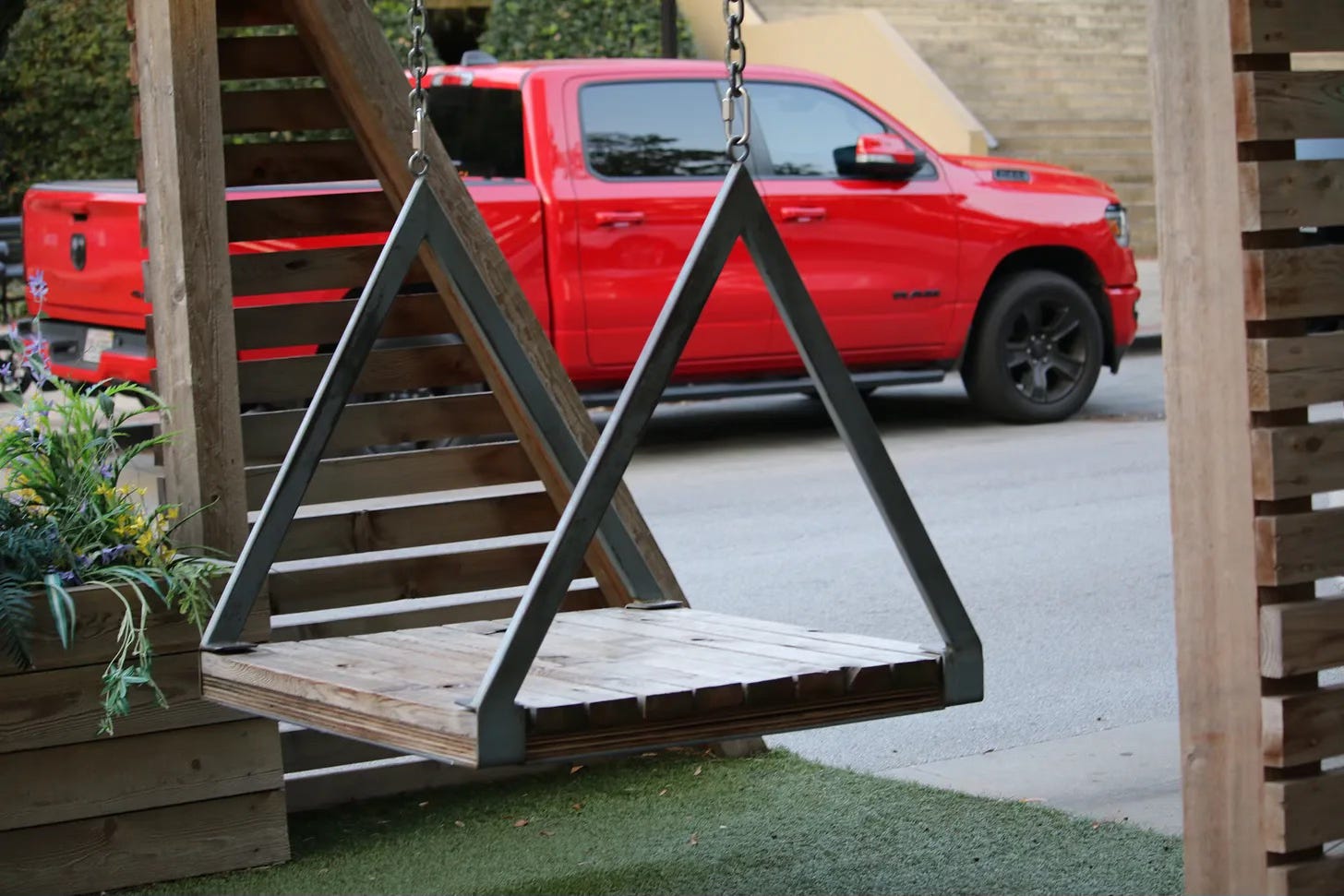 Huntsville’s downtown street design is simple, with lovely clean non-cracked sidewalks and places that feel safe for people to sit, wander, play, chat, relax, work and do whatever they need to do. I especially love the big swings and games for kids of all ages. There is shade and flowers and benches and did I mention the bike share?