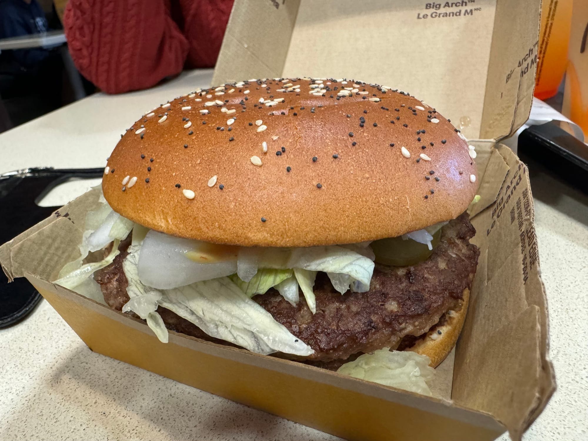 I was sort of curious about the unimaginative name of the new burger, and it turns out it’s nothing more complicated than accurate marketing. It’s big and full of starch. It looks like a large Big Mac with white cheese and poppyseeds on the top bun. Tastes like it too.